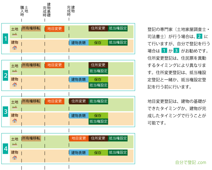 登記によっては、行うタイミングが、複数の場合があり、また、金融機関から融資を受けるタイミングや、住民票を異動するタイミングによって、登記を行う順序が変わります。