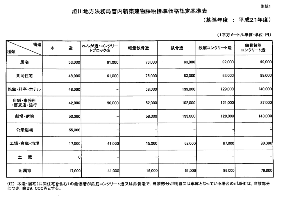 平成23年の新築建物課税標準価格認定基準表は平成21年と同じであることを旭川法務局に確認済み。